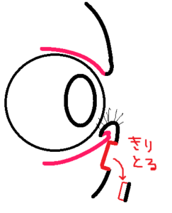 この手術、理屈と手順は単純なのです。内反しているまぶたの皮膚を数ミリの幅で切り取ってしまい、その隙間を縫い縮めることでまぶたを引っ張ろう、というものです。