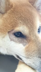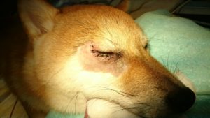 琥珀さんは数カ月前に他の犬に咬まれて目の近くをケガし、その傷は治ったものの、まぶたの皮膚に変なクセがついて内反症になってしまったようです。